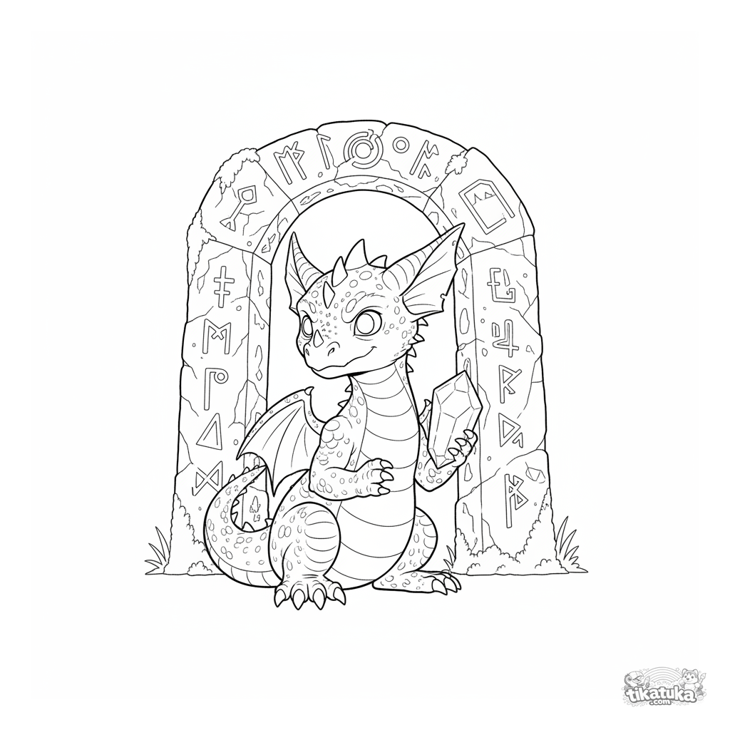 Página para colorear para preadolescentes de 7-9 años: un joven dragón hace guardia ante un misterioso portal de monolitos con runas. Detalle moderado, pose expresiva, una escena con contexto para colorear.