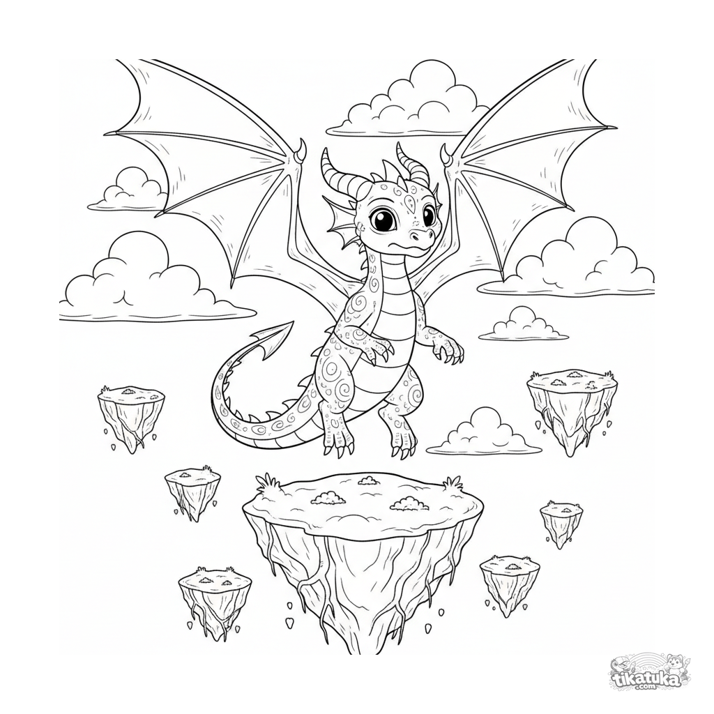 Página para colorear para niños mayores 10-12: un dragón joven con alas grandes aprendiendo a volar sobre islas flotantes cubiertas de musgo. Escena de fantasía detallada.