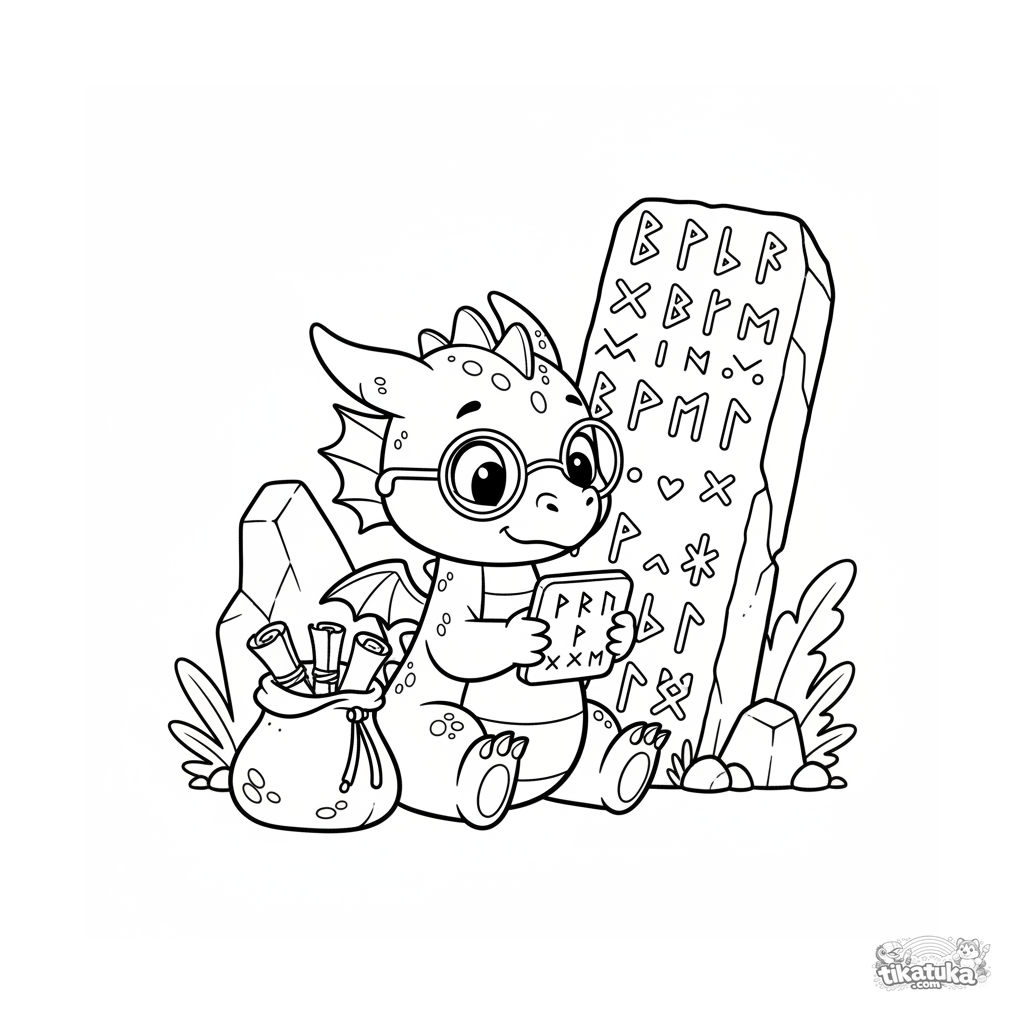 Página para colorear para niños 7-9: un joven dragón con gafas estudia inscripciones rúnicas, comparando una tablilla con un gran monolito. Pose dinámica, detalle moderado, espíritu aventurero.