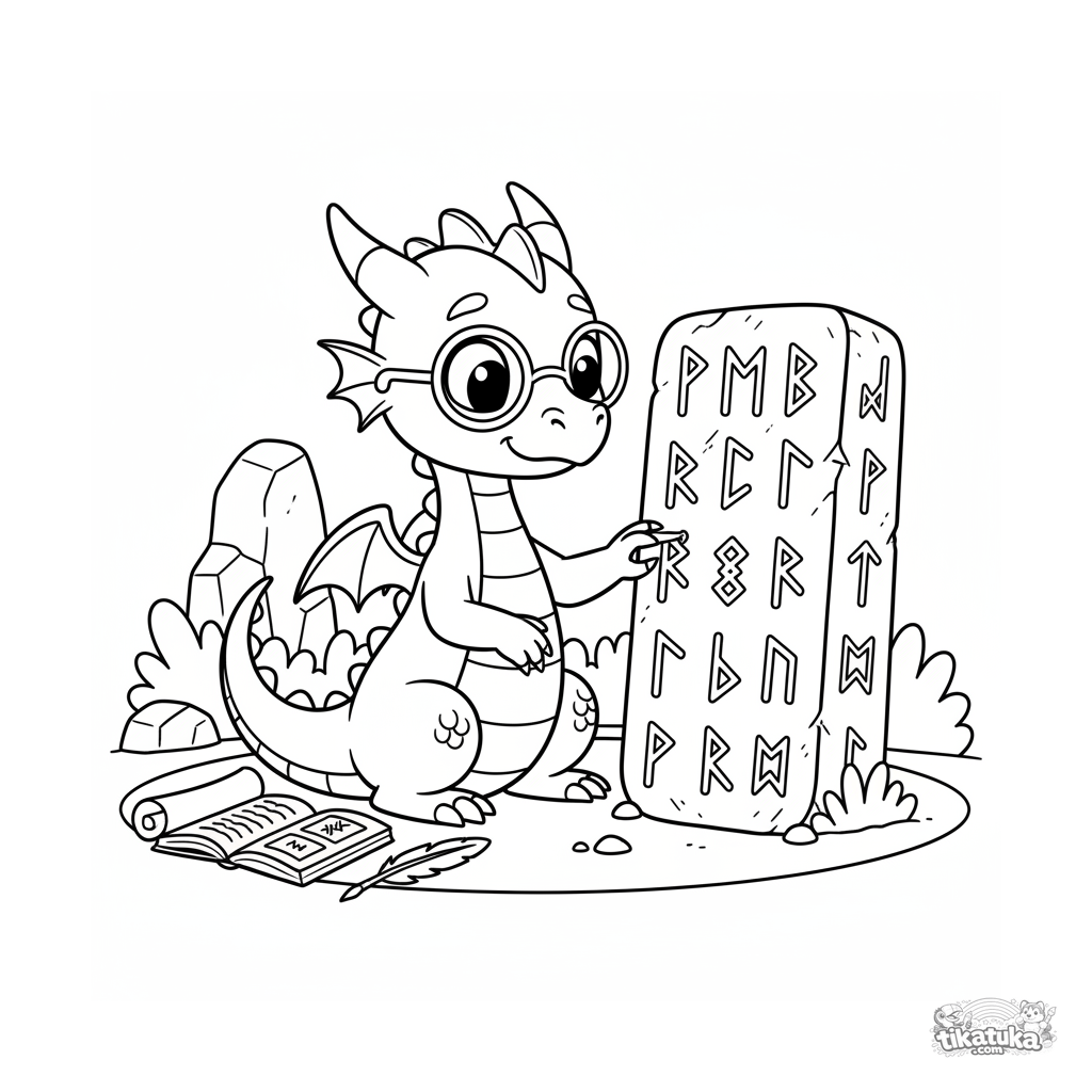 Página para colorear para preadolescentes 7-9: un joven dragón con gafas estudia runas en un antiguo monolito. Un pergamino y una pluma cerca, escena detallada para colorear.