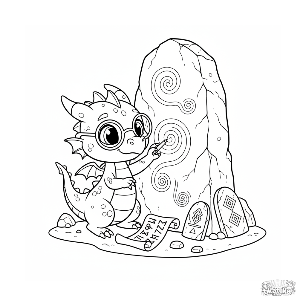 Página para colorear para niños de 7 a 9 años: un dragón joven con gafas estudiando runas en un monolito. Pose expresiva, detalle moderado.