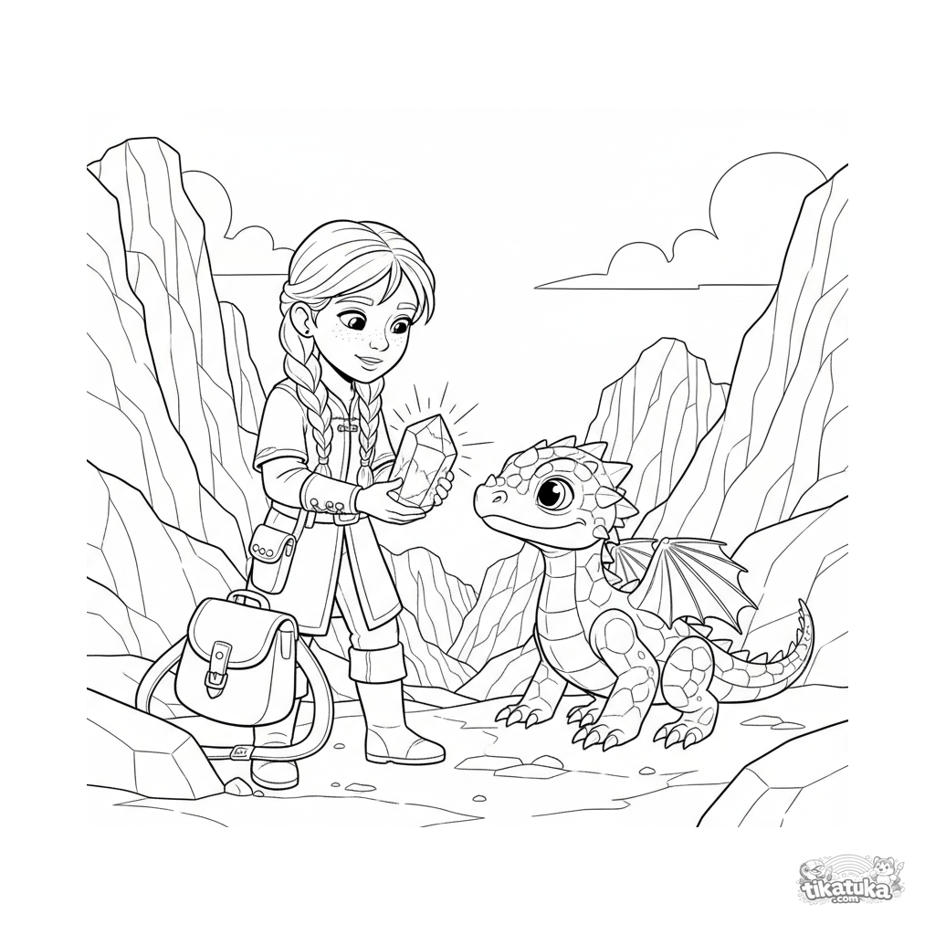 Página para colorear para niños 7-9: una joven domadora de dragones se hace amiga de una cría de dragón de roca en un cañón rocoso. Estilo realista suave.