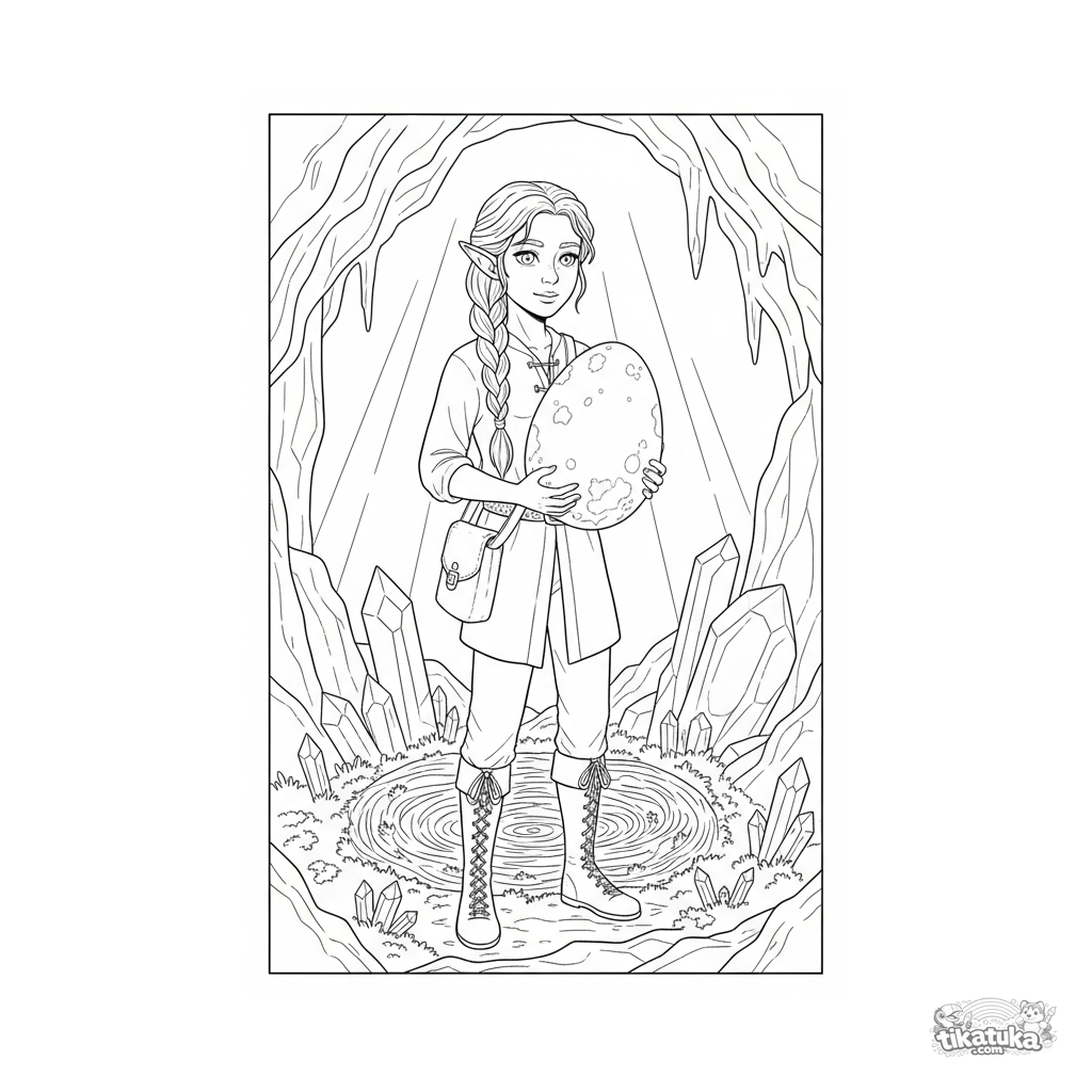 Página para colorear para 10-12 años: un joven elfo descubre un huevo de dragón brillante en una cueva de cristal. Escena detallada para colorear creativamente.