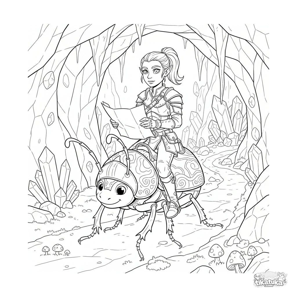 Página para colorear para 10-12 años: un explorador elfo montando un escarabajo gigante explora una cueva de cristal luminosa. Escena detallada para amantes de la fantasía.