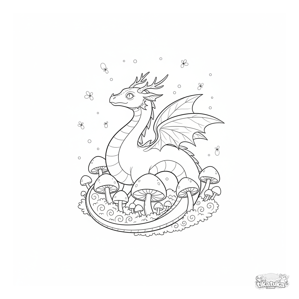 Página para colorear para niños: un lindo dragón del bosque guardando un anillo mágico de hongos brillantes.