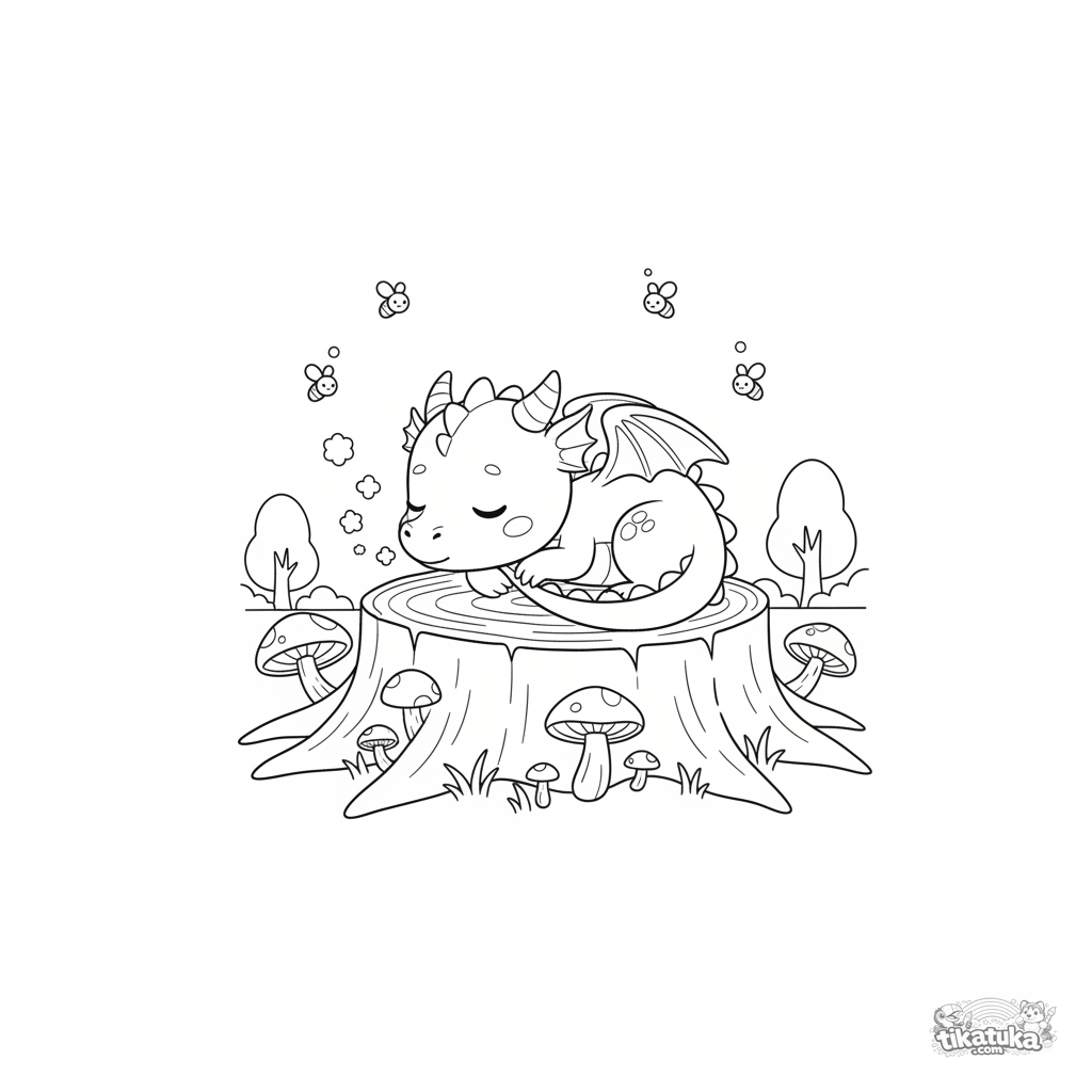 Página simple para colorear para niños pequeños de 2-3 años: un lindo dragón del bosque duerme en un tocón cubierto de hongos. Formas grandes, contornos gruesos, casi sin fondo.