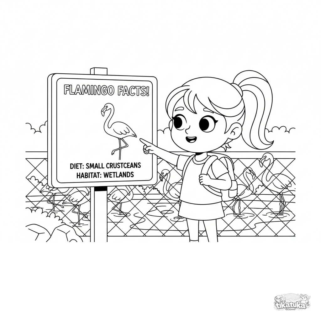 Página para colorear para niños de 7-9 años: una niña aprende de un cartel educativo sobre flamencos en el zoológico.