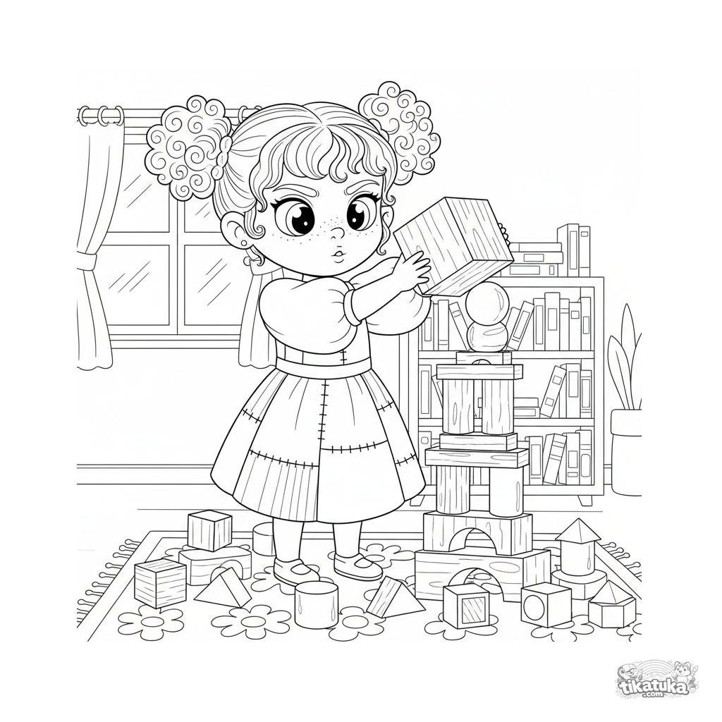 Página para colorear para niños pequeños de 2-3 años: una niña con vestido construye una torre alta con bloques grandes. Formas simples ideales para manitas.