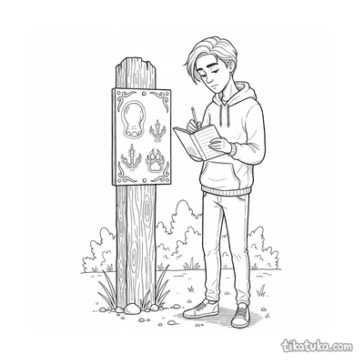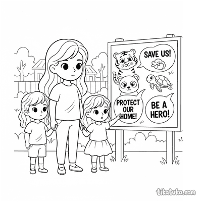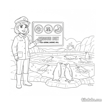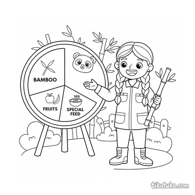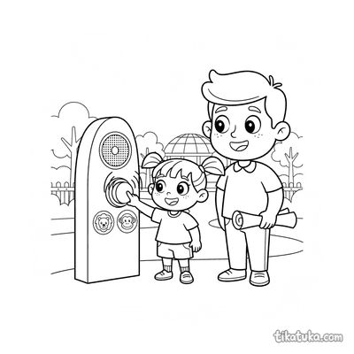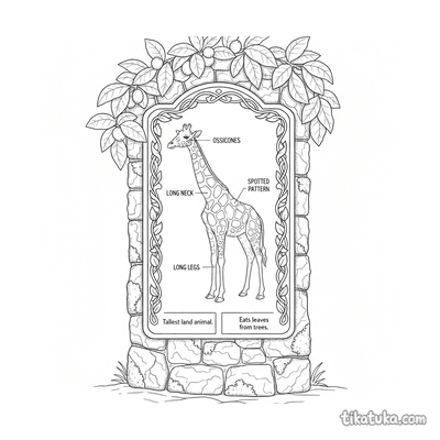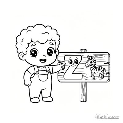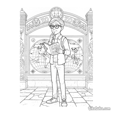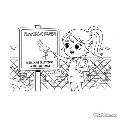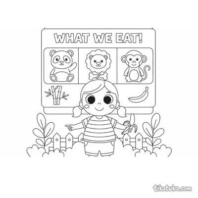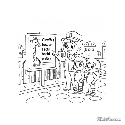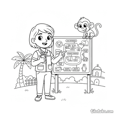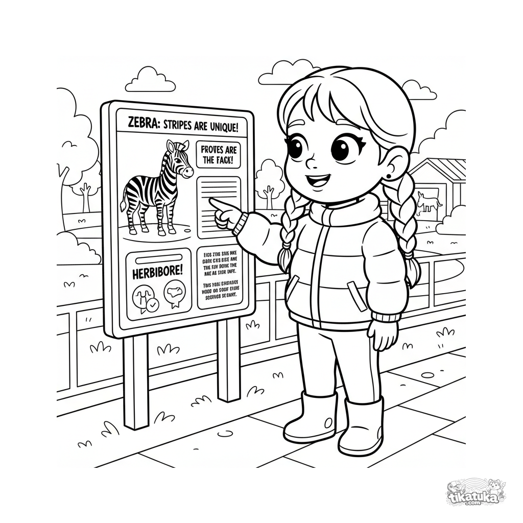 Página para colorear para niños de 4-6 años: una niña aprendiendo de un cartel informativo sobre cebras en el zoológico.