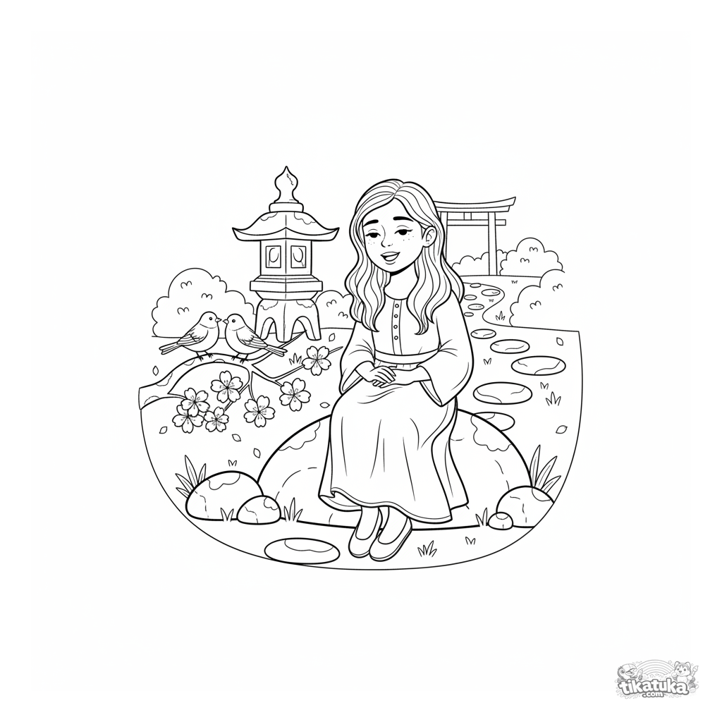 Página para colorear para niños: una niña en un vestido folclórico se sienta en un jardín de santuario cantando, con pájaros en una rama de cerezo.