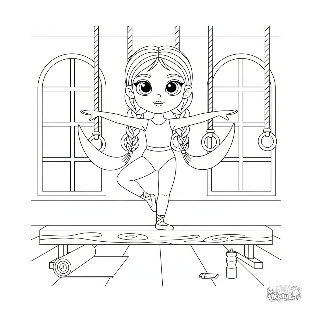 Página para colorear para niños: una joven gimnasta realizando una postura en la barra de equilibrio en un gimnasio. Para 4-6 años.