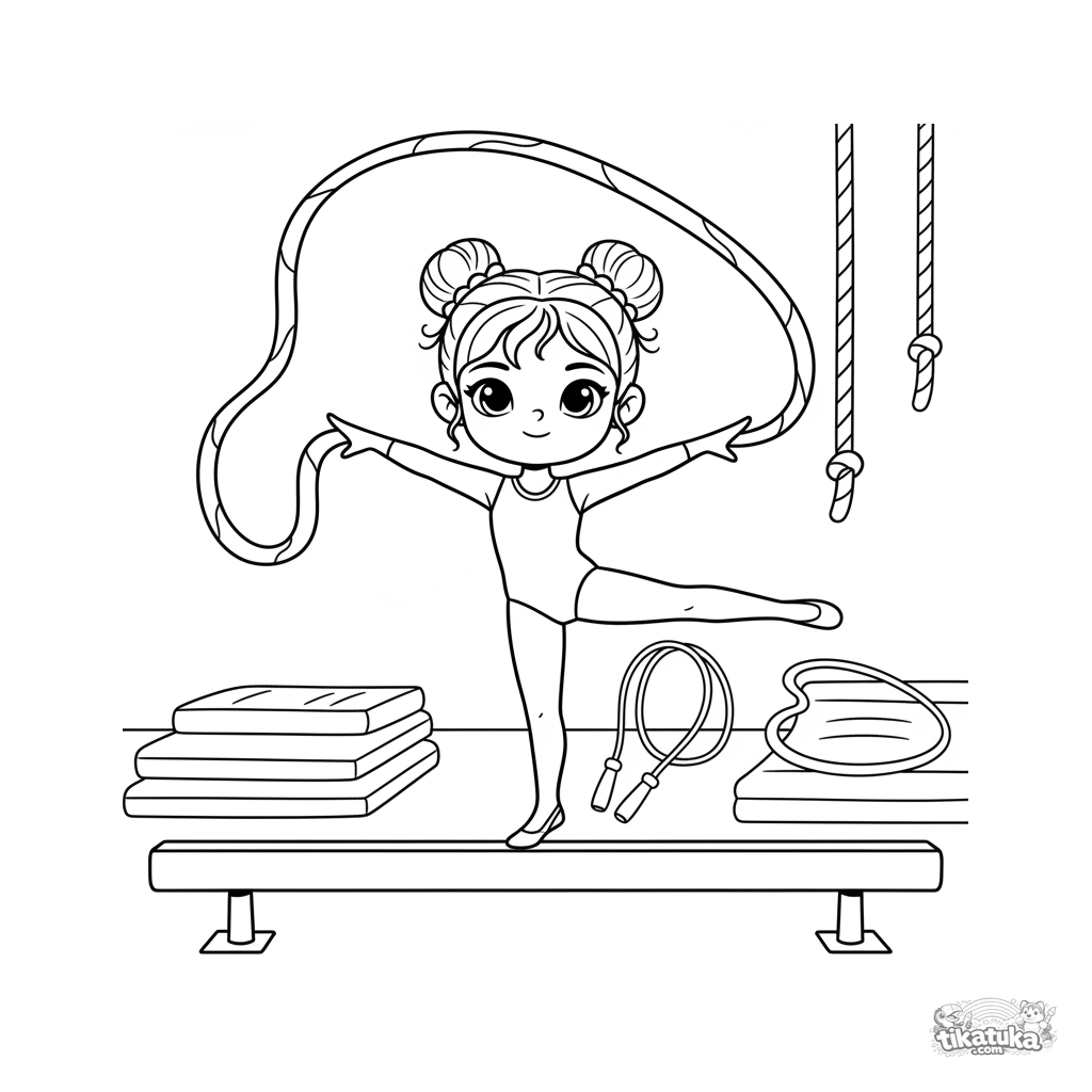 Página para colorear: una gimnasta en la barra de equilibrio con una cinta en el gimnasio. Para 4-6 años.
