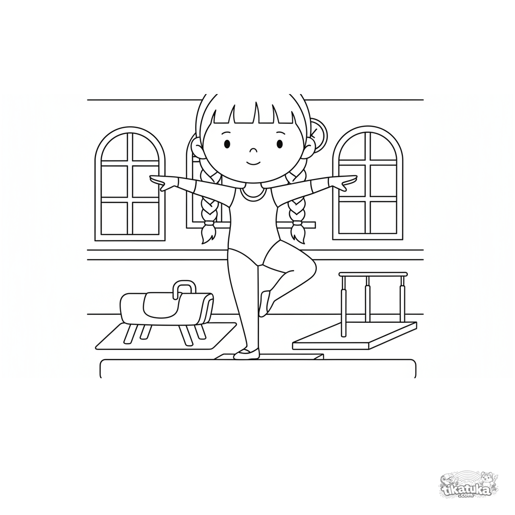 Página para colorear para niños 4-6: una joven gimnasta realizando una pose en la barra de equilibrio en un gimnasio. Escena deportiva simple y elegante.