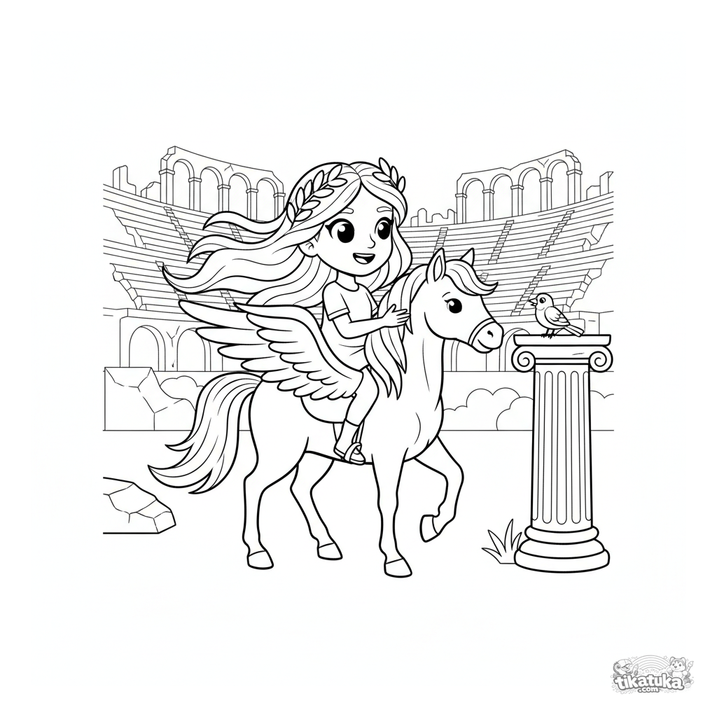 Página para colorear para niños: una joven heroína vuela en un pegaso a través de un anfiteatro antiguo. Escena para la imaginación, adecuada para niños de 4 a 8 años.