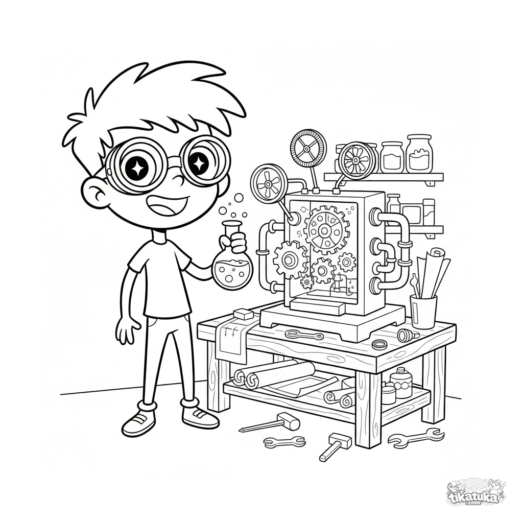 Página para colorear para niños de 7-9 años: un joven inventor en un laboratorio secreto prueba su ingeniosa máquina de burbujas entre planos y herramientas.