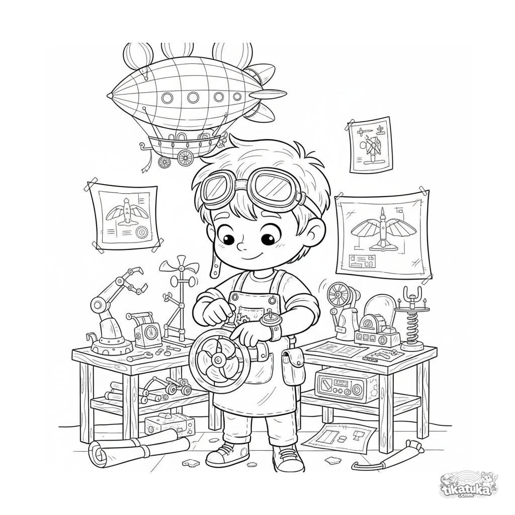 Página para colorear para niños 7-9: un joven inventor en un laboratorio secreto ajusta sus gafas voladoras entre planos y modelos de aeronaves.