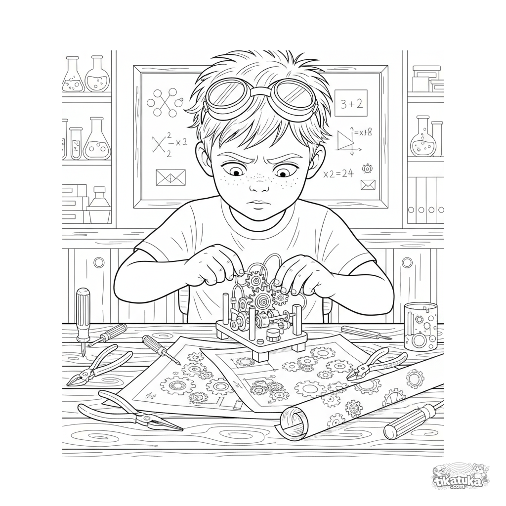 Página para colorear para 10-12 años: un joven inventor trabajando en un artilugio mecánico en un aula. Escena detallada de ciencia y tecnología.