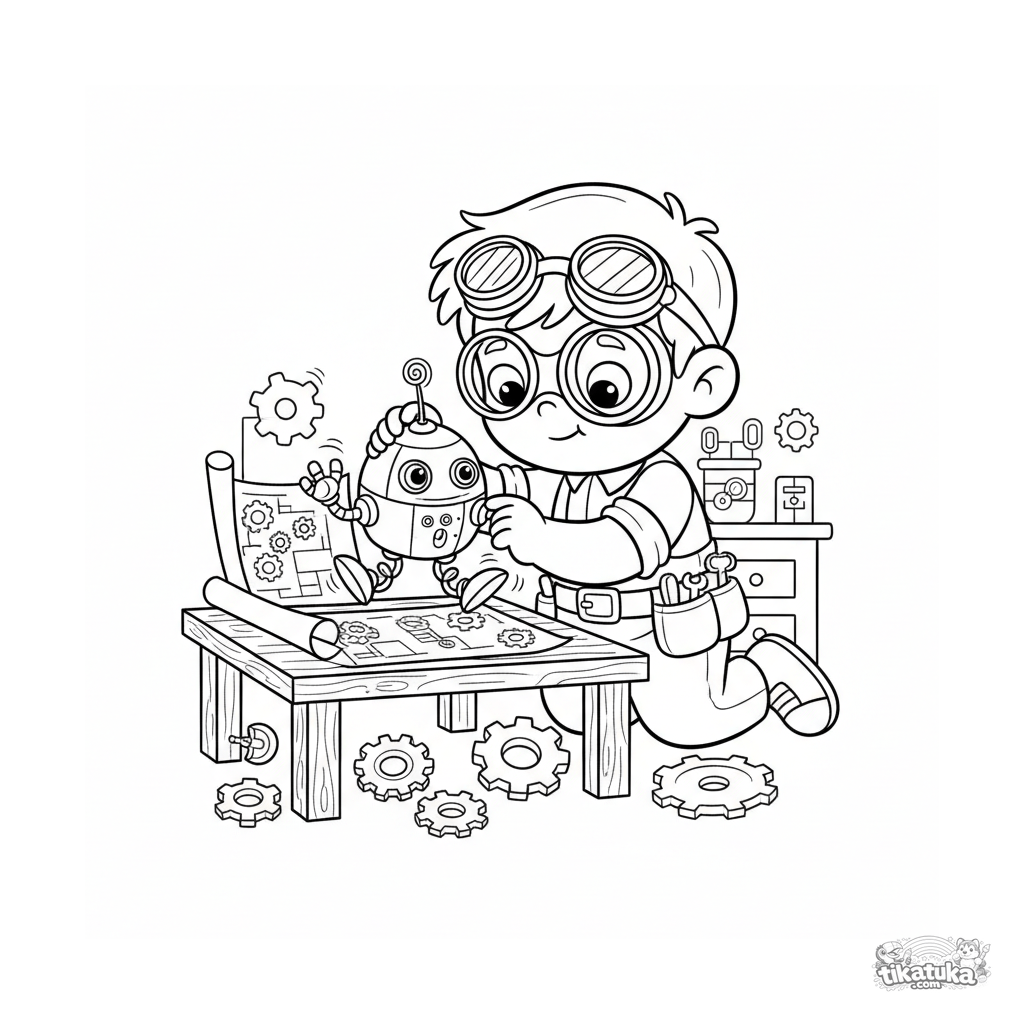Página para colorear para niños 4-6: un joven inventor y su robot saltarín en un laboratorio secreto lleno de planos y engranajes.