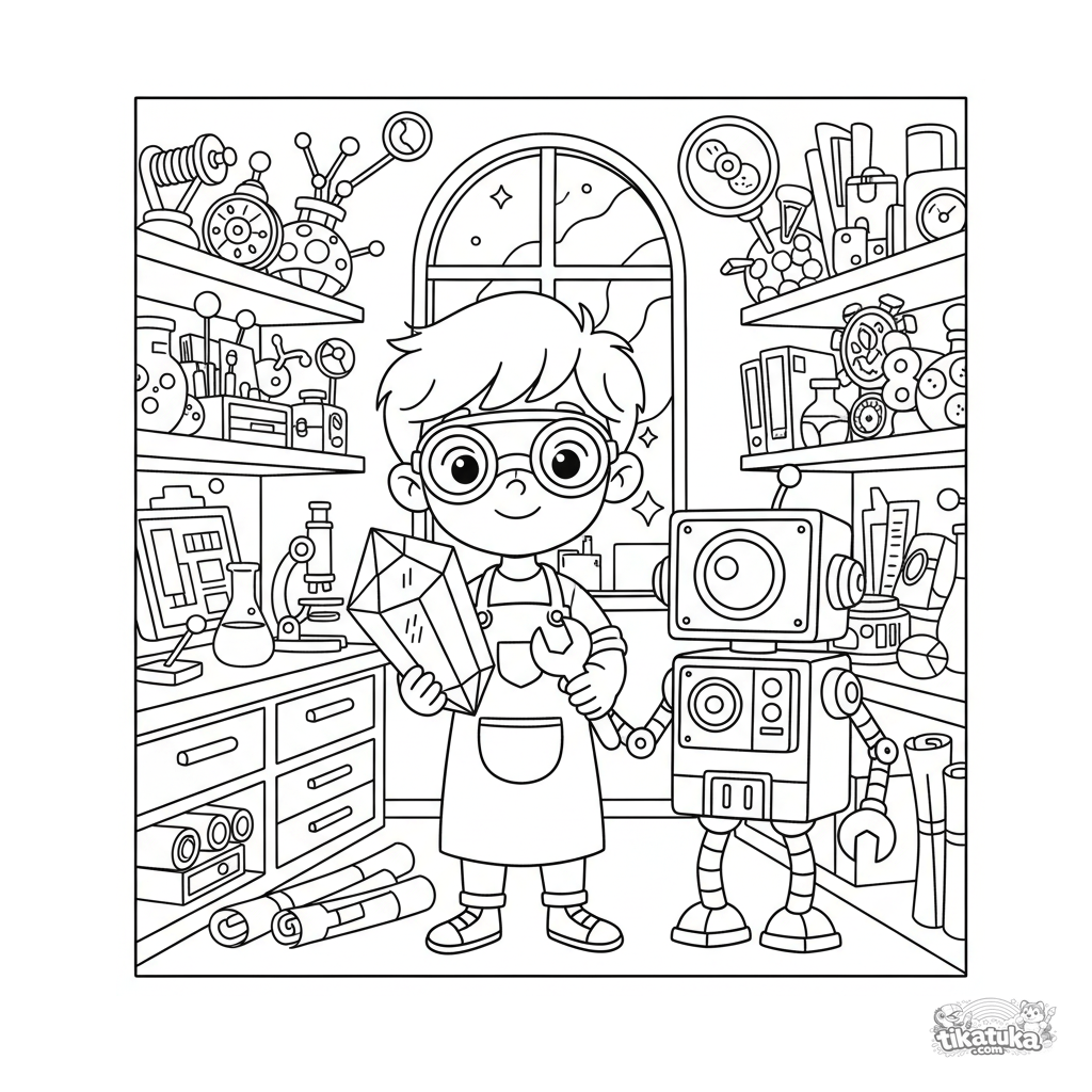 Página para colorear para niños de 7-9 años: un joven inventor y su robot asistente en un laboratorio secreto lleno de dispositivos.