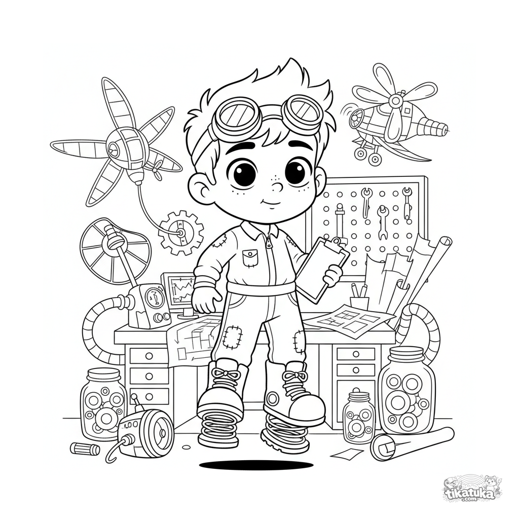 Página para colorear para niños 4-6: un joven inventor prueba botas de resorte en su laboratorio secreto, lleno de planos y piezas.