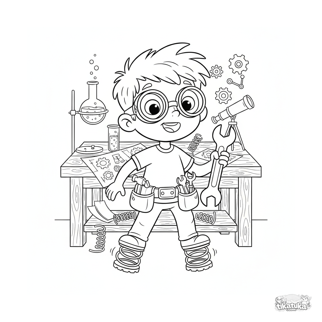 Página para colorear para niños 4-6: un joven inventor probando botas de resorte en un laboratorio secreto. Planos y herramientas en el banco.