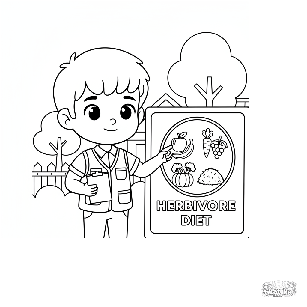Página para colorear para niños 7-9: un joven cuidador en un panel informativo explica qué comen los herbívoros. Escena educativa sobre profesiones y nutrición animal.