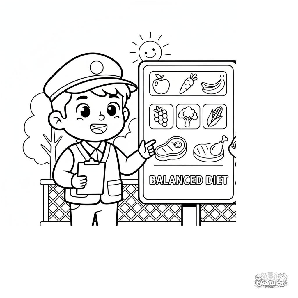 Página para colorear para niños de 7-9 años: un joven cuidador del zoológico explica dietas balanceadas de animales en un letrero informativo. Escena educativa sobre nutrición.