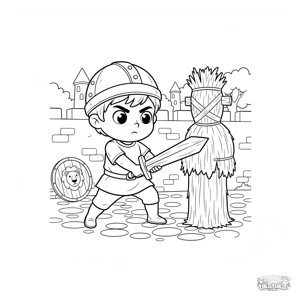 Página para colorear para niños: un joven caballero practica con una espada de madera contra un maniquí de paja en el patio de un castillo. Para 4-6 años.