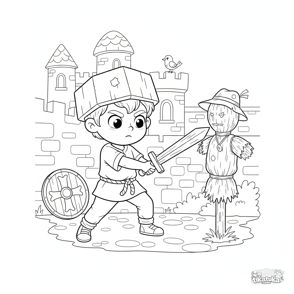 Página para colorear para niños de 4 a 6 años. Un joven caballero con casco de cartón practica con una espada de madera en un maniquí de paja en el patio del castillo. Escena de acción.