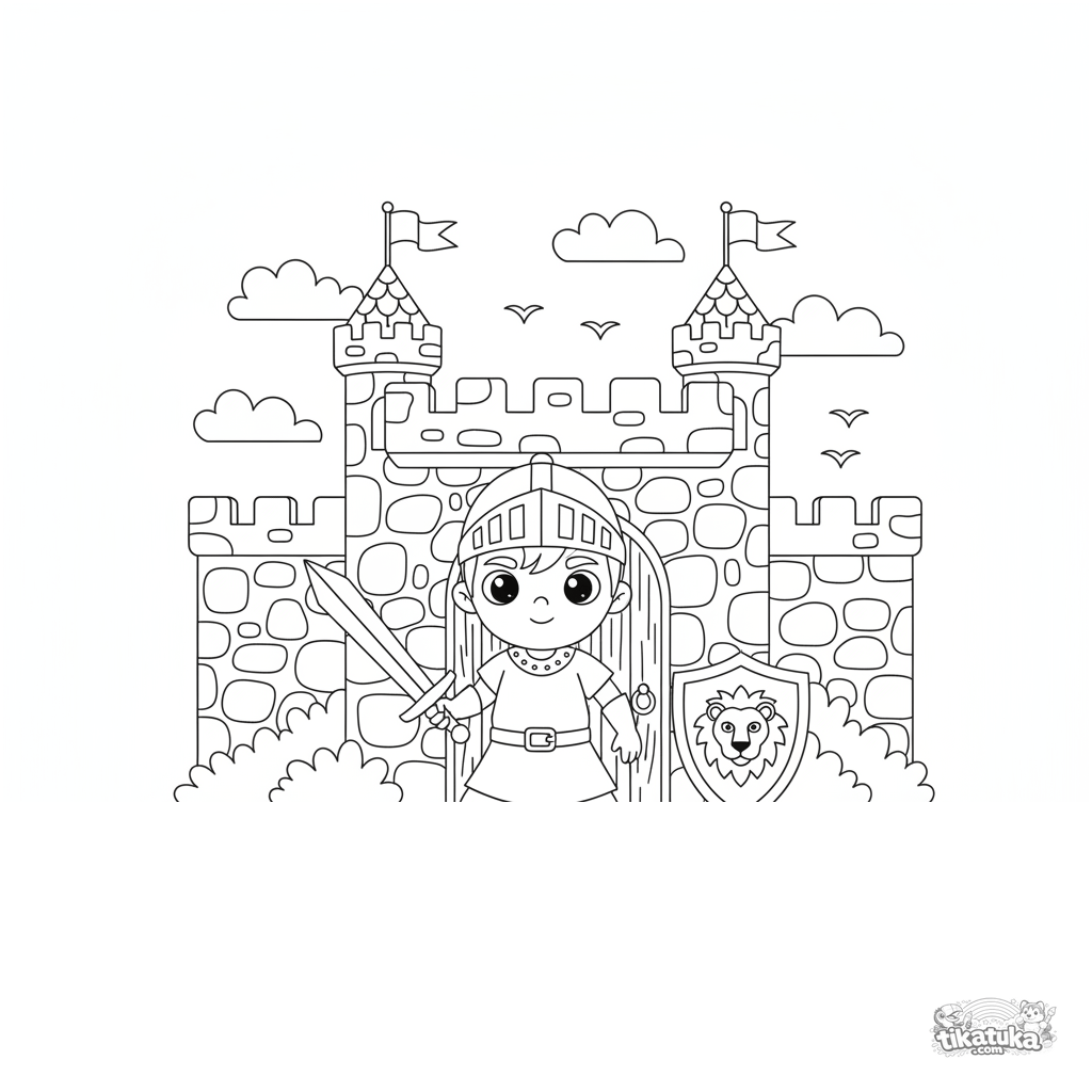Página para colorear para niños 4-6: un niño caballero practica con una espada de madera ante la puerta de un castillo de piedra. Formas claras, escudo con blasón.