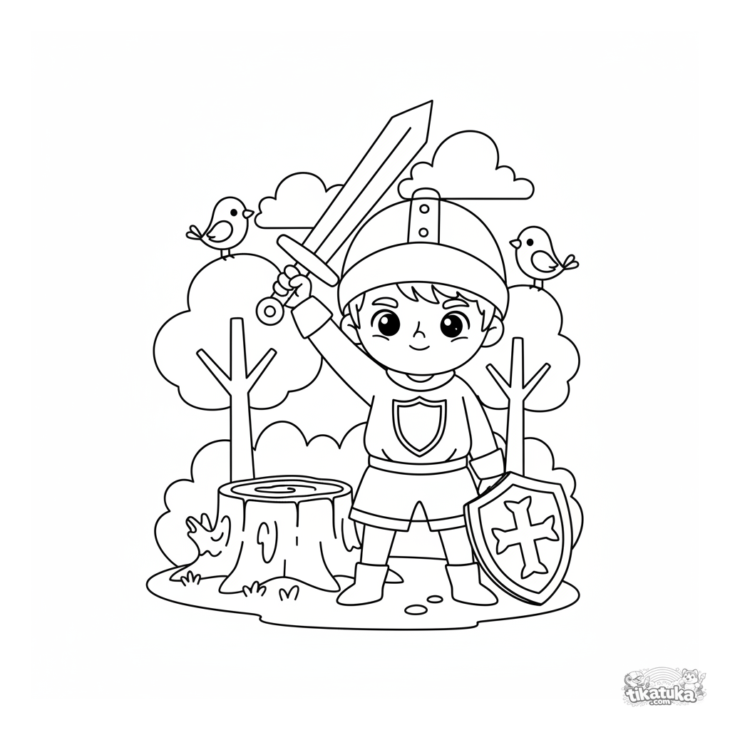Página para colorear para niños: un joven caballero con armadura practica con una espada de madera junto a un tocón. Incluye escudo y crest, para 4-6 años.