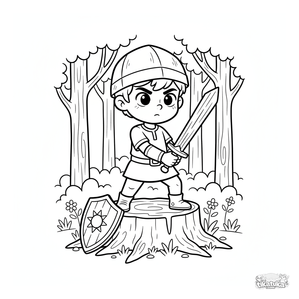Página para colorear para niños 4-6 años: un joven caballero practica con una espada de madera en un tocón del bosque. Escena activa y simple.