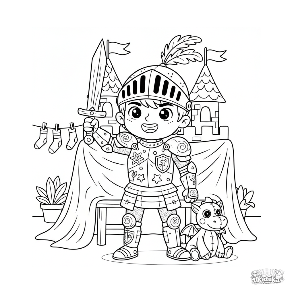 Página para colorear para niños 3-6: un joven caballero con armadura de cartón y casco de colador se yergue orgulloso con una espada de madera en el patio trasero frente a un castillo de mantas.