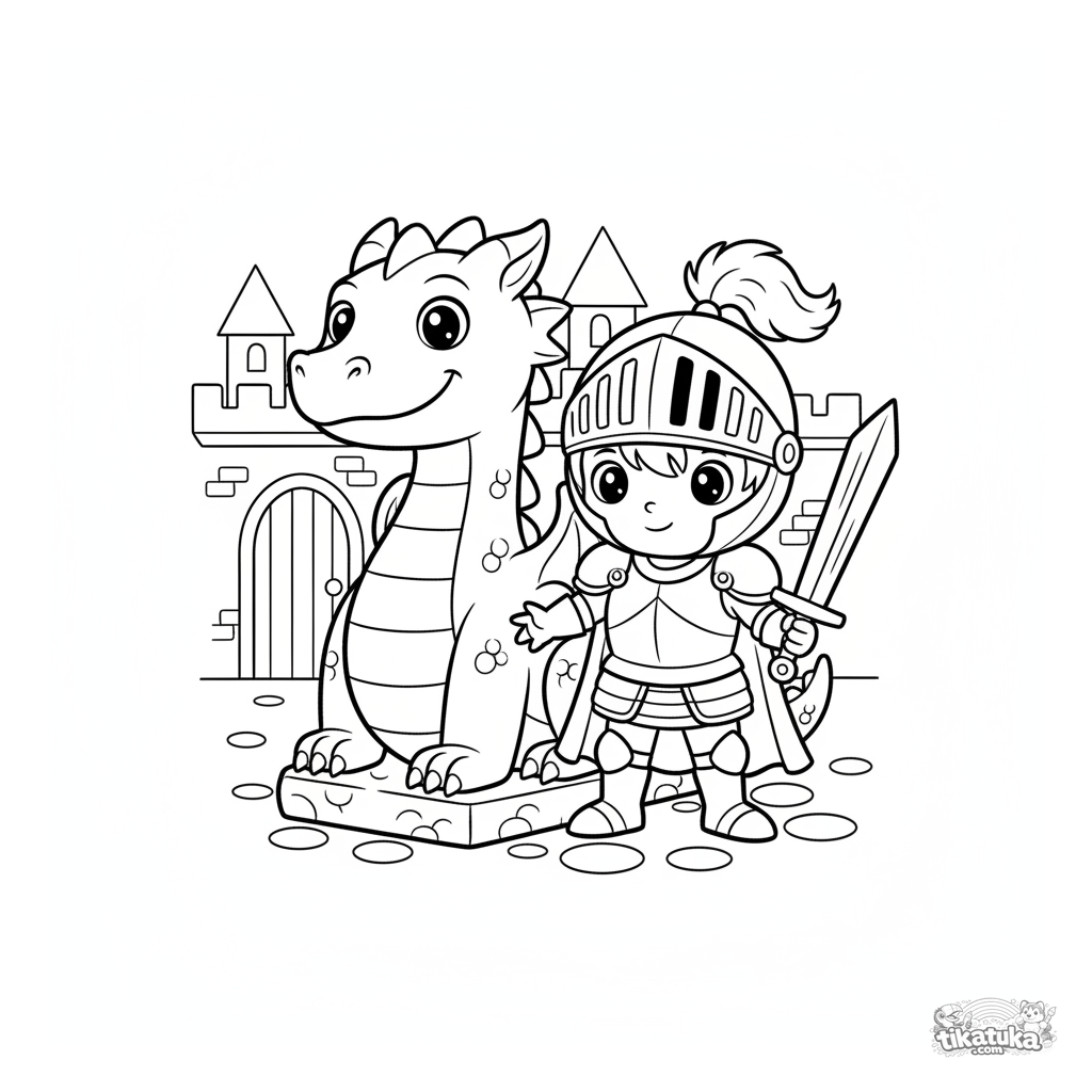 Página para colorear de un joven caballero con armadura brillante sosteniendo con orgullo una espada de madera junto a una estatua de dragón de piedra. Para niños de 4 a 6 años.