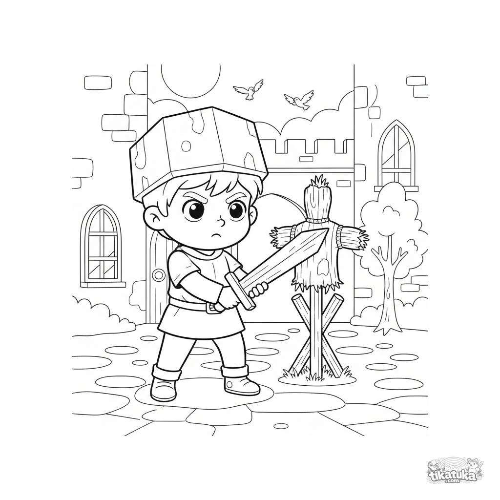 Página para colorear de un joven caballero entrenando con una espada de madera en el patio del castillo. Escena de acción para niños de 4-6 años.