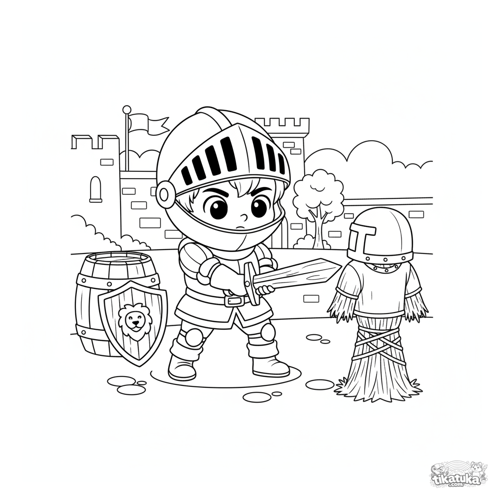 Página para colorear de un joven caballero entrenando con una espada de madera en el patio de un castillo. Para niños de 4 a 6 años. Lleva armadura y practica con un muñeco de paja.