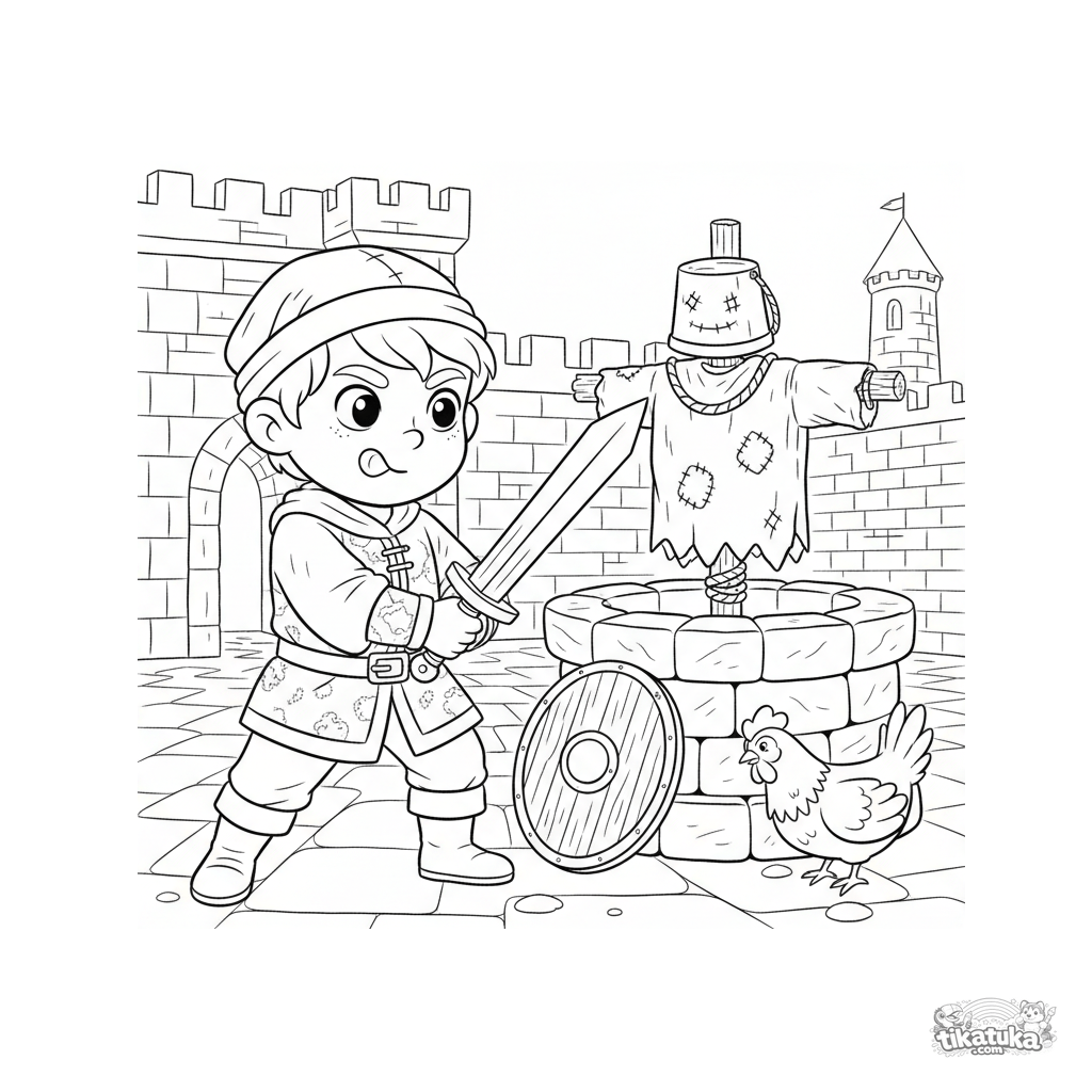 Página para colorear de un joven caballero en entrenamiento practicando con una espada de madera junto al pozo de un castillo. Para niños de 6-9 años.