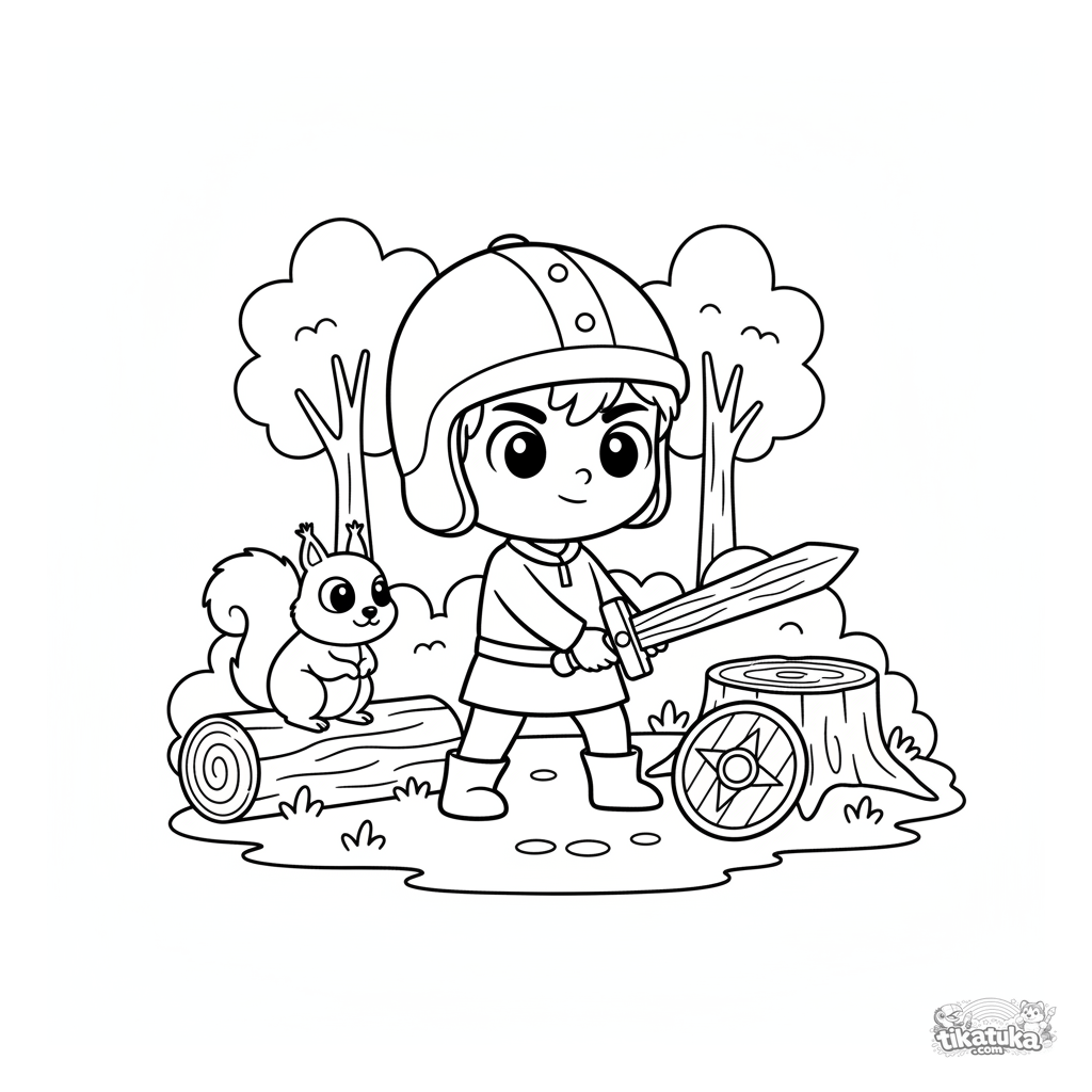 Página para colorear para niños: un joven caballero entrena con una espada de madera en un claro del bosque. Para niños pequeños de 2 a 5 años. Detalles simples y grandes.