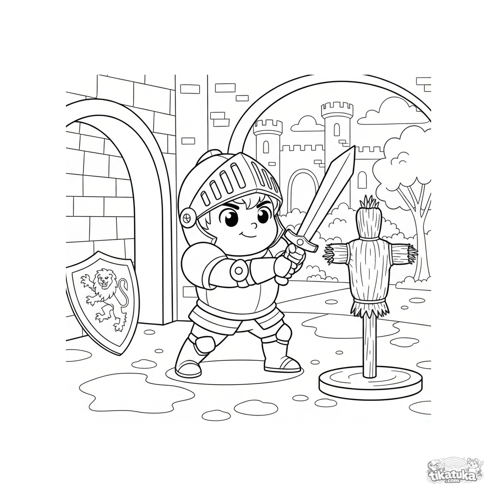 Página para colorear para niños con un joven caballero entrenando con una espada en un patio de castillo. Para niños de 4 a 6 años.