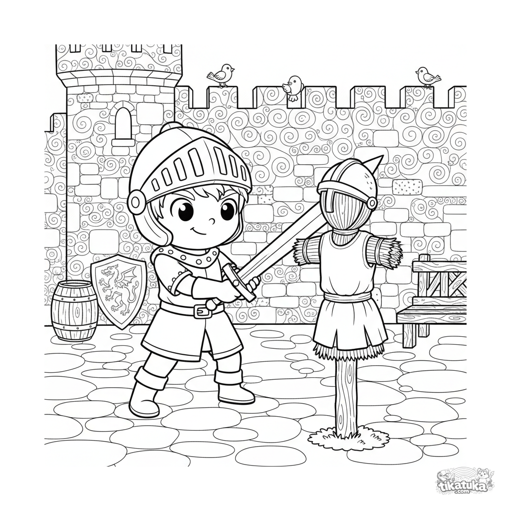 Página para colorear de un joven caballero en entrenamiento practicando con una espada de madera contra un maniquí de paja en el patio de un castillo. Para 6-9 años. El caballero está concentrado, con un escudo descansando cerca.