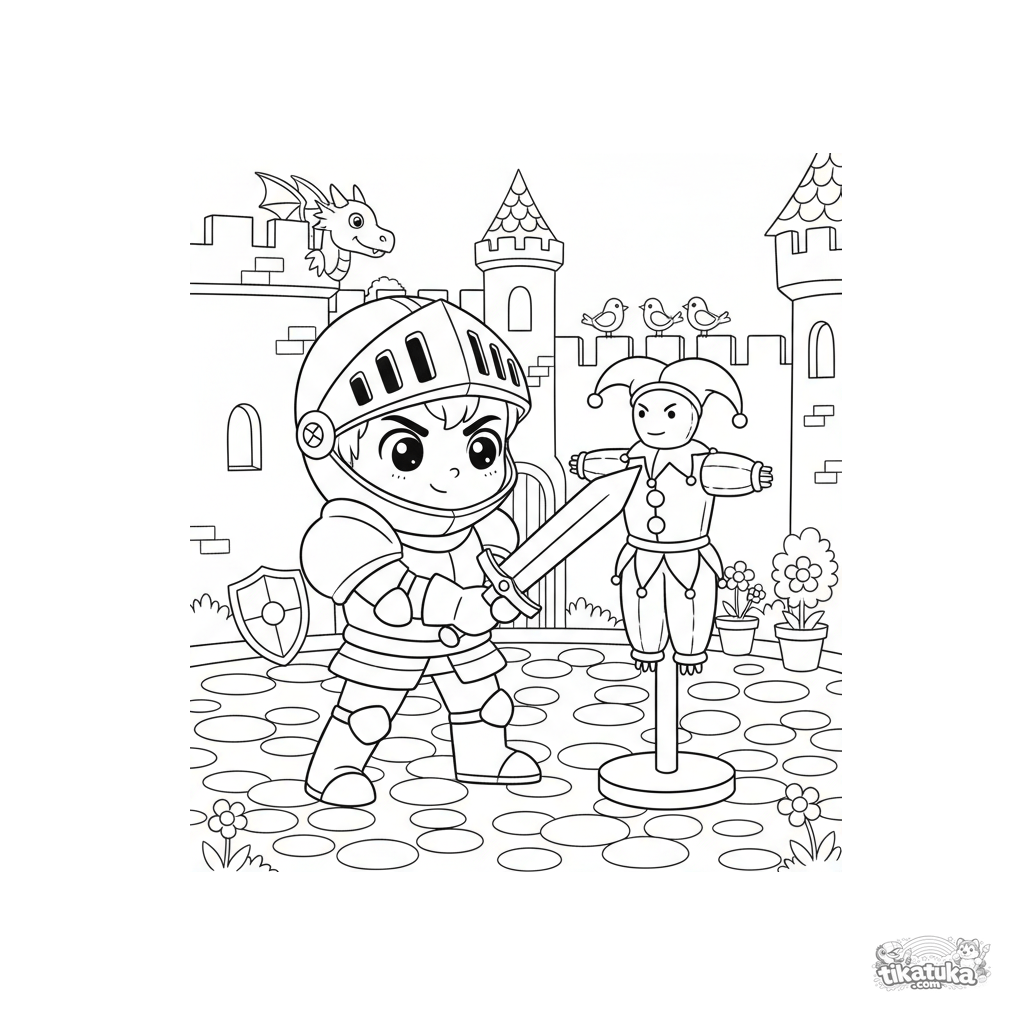 Página para colorear para niños 4-6 años: un joven caballero en armadura entrena con espada de madera contra un maniquí en un patio de castillo. Escena activa.