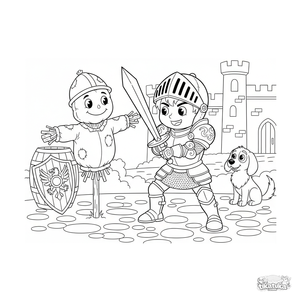Página para colorear de un joven caballero practicando con una espada de madera contra un espantapájaros. Para niños de 6 a 9 años.