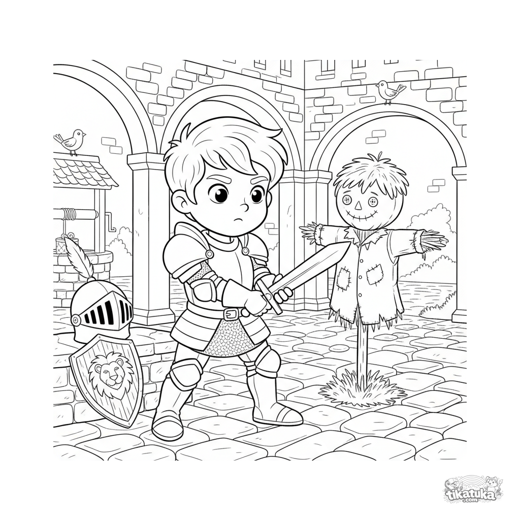 Página para colorear de un joven caballero practicando esgrima contra un espantapájaros en el patio de un castillo. Para niños de 6-9 años. Escena detallada.