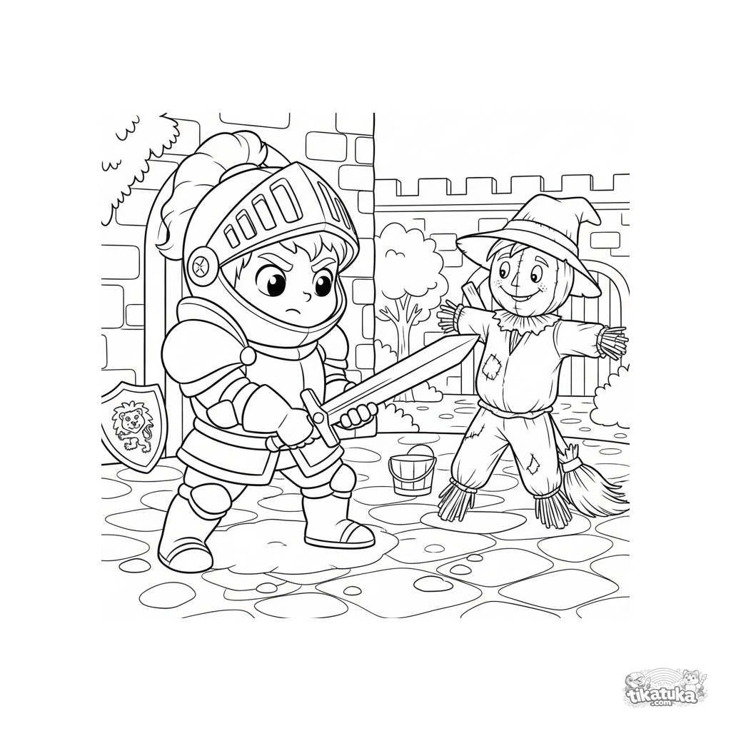Página para colorear para niños de 4-6 años: un joven caballero con armadura practica esgrima con una espada de madera en el patio de un castillo.