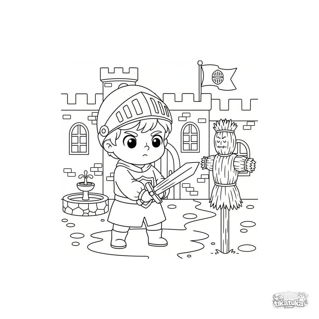 Página para colorear para niños de 4-6 años: un joven caballero con armadura simple practica con una espada de madera en un maniquí de paja en el patio de un castillo.