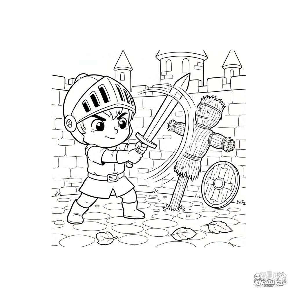 Página para colorear para niños 4-6 años: un joven caballero entrena con una espada de madera en el patio de un castillo. Escena de acción simple.