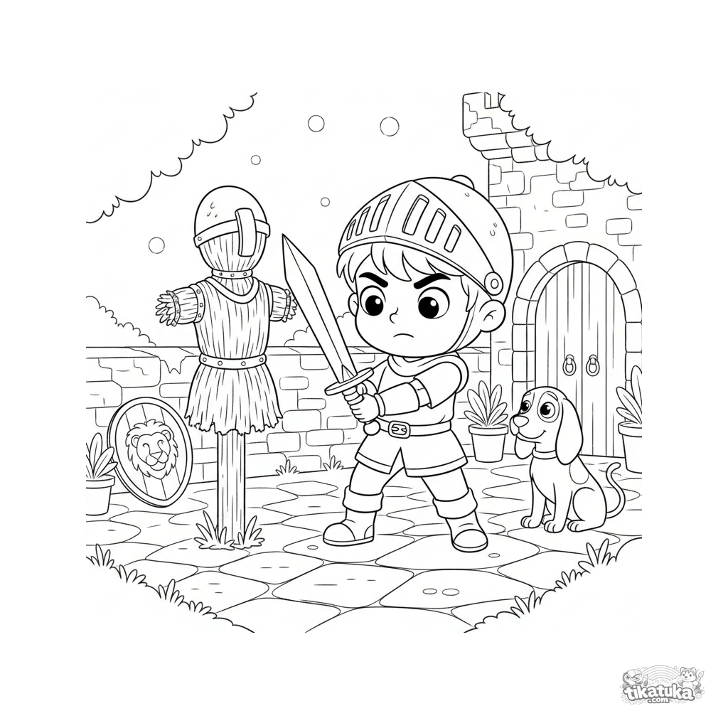 Página para colorear de un joven caballero entrenando con espada de madera en el patio de un castillo. Para niños de 5 a 8 años. Escena con muñeco de práctica y perro leal.