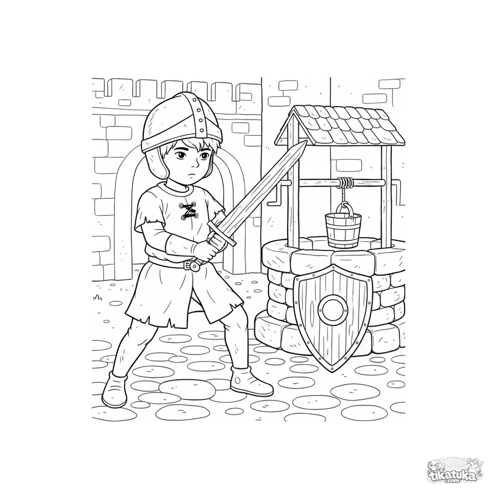 Página para colorear para niños 5-7: un joven caballero practica con una espada de madera en el patio de un castillo.