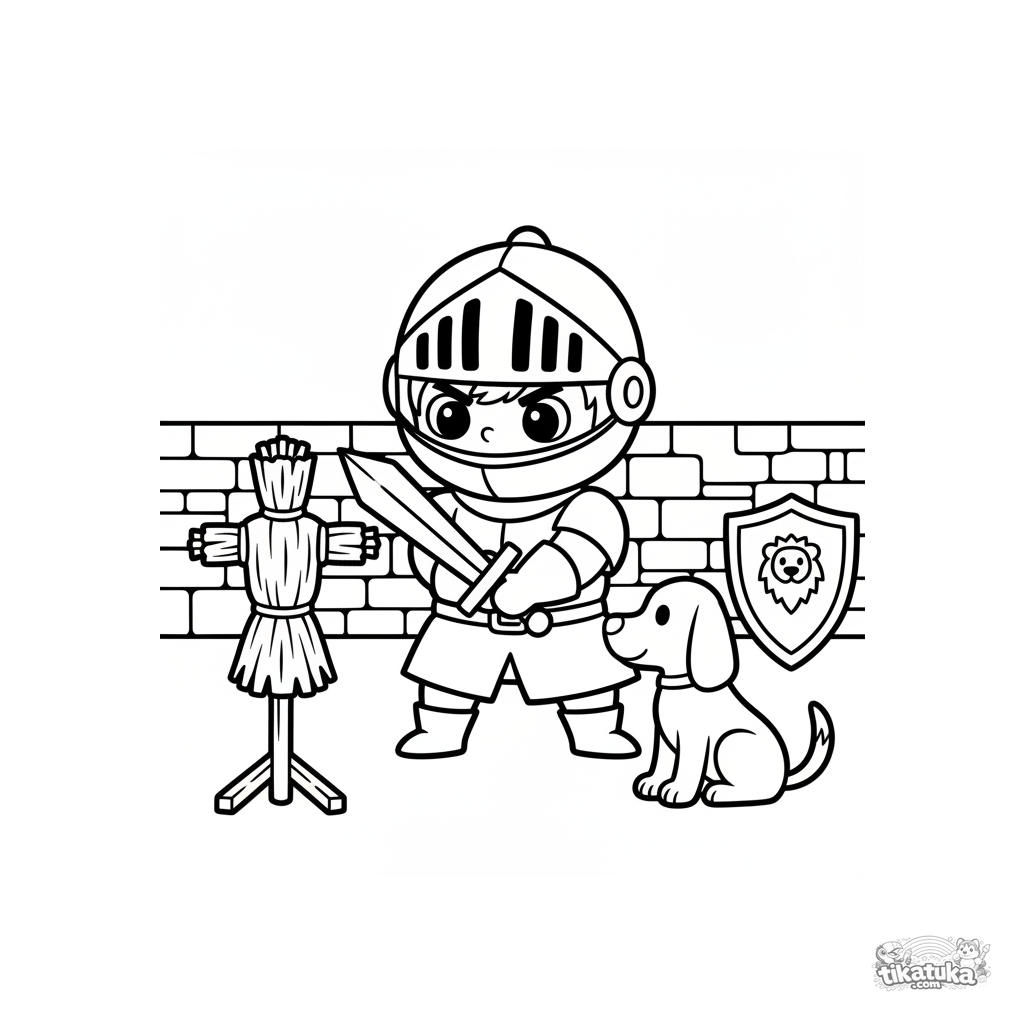 Página para colorear para niños pequeños 2-5: un joven caballero practica con una espada de madera contra un muñeco de paja en el patio del castillo. Contornos simples.