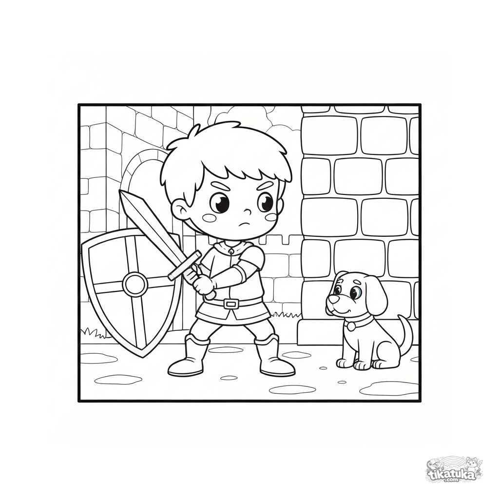 Página para colorear de un joven caballero entrenando con una espada de madera en el patio de un castillo. Para niños de 3 a 5 años.